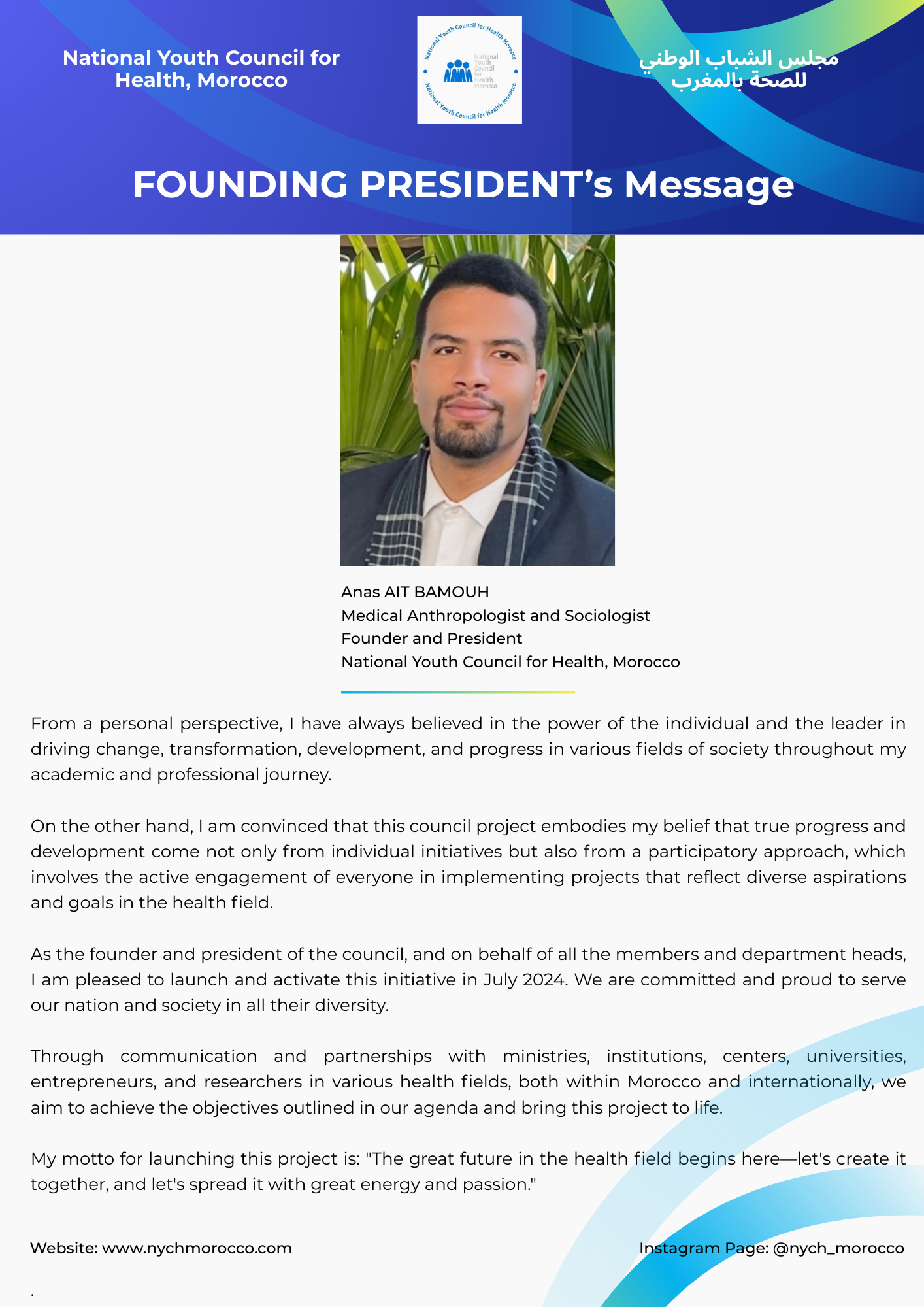 The National Youth Council for Health in Morocco is a non-governmental, nonprofit organization founded in July 2024 in Casablanca, Morocco and includes 24 departments in different health fields. It was established as a personal initiative and project — the first of its kind in Morocco — by Anas AIT BAMOUH, a medical anthropologist and Sociologist and Social Entrepreneur.